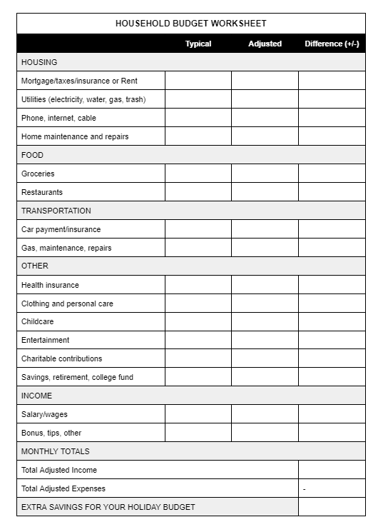 Then consider how your standard wages may be adjusted this month by extra shifts, additional tips, or an end-of-year bonus. By decreasing your spending and/or increasing your income, you can build room in your budget for holiday gifts and gatherings.